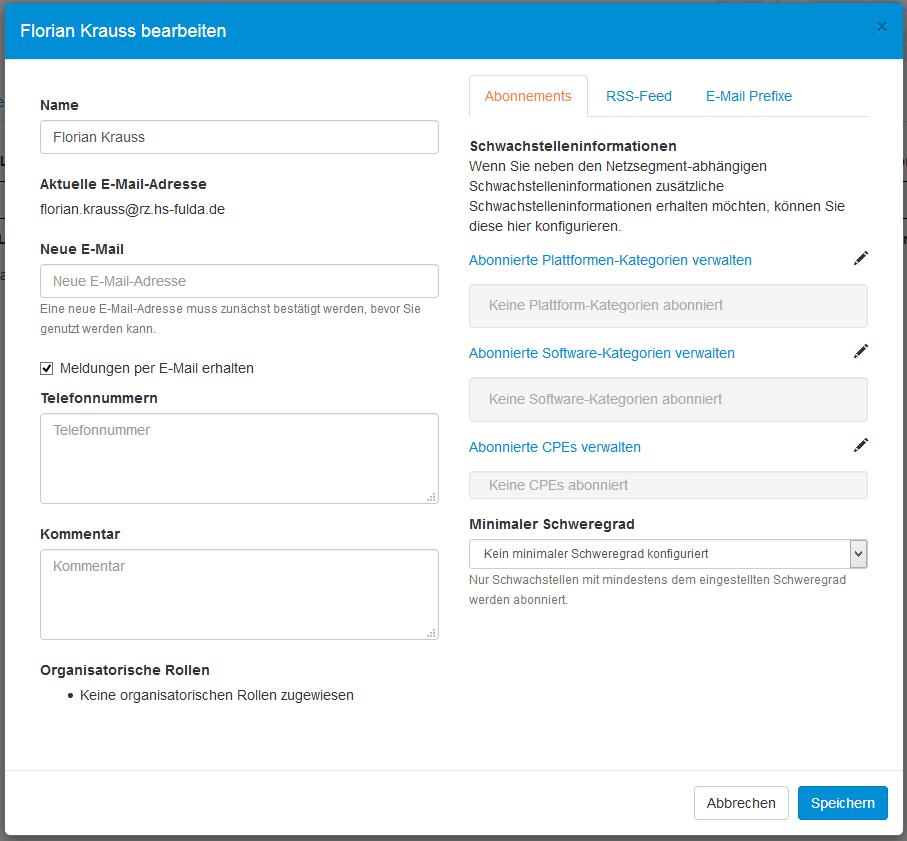 Nach der Anmeldung kann eine Individuelle Konfiguration der persönlichen Schwachstellenmeldungen vorgenommen werden. Hier sollte jeder nur die für sie/ihn relevanten Kategorien wählen, um nicht eine Flut unnötiger Meldungen zu erhalten.