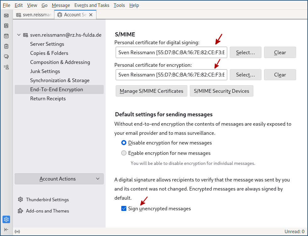 Wenn Sie in Thunderbird eine E-Mail verfassen, sehen Sie am oberen Rand des Fensters Funktionen zum digitalen signieren oder verschlüsseln der E-Mail.