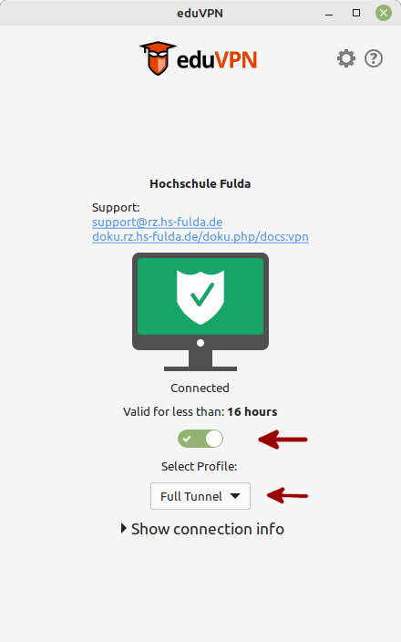 Ihnen wird nun das konfigurierte VPN-Profile angezeigt. Klicken Sie erneut auf die Hochschule Fulda, um dieses auszuwählen. Anschließend werden Ihnen verschiedene Profile (Full Tunnel und Split Tunnel) angezeigt, wo Sie Full Tunnel auswählen können. Mit dem Schalter können Sie das VPN ein- bzw. ausschalten.