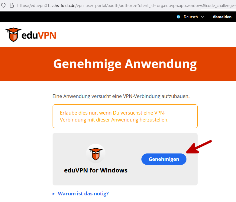 Es wird ein Browserfenster geöffnet, das Sie auf die Loginseite des Identitätsprovider der Hochschule Fulda führt. Melden Sie sich hier mit Ihrer fd-Nummer an und bestätigen Sie anschließend den Aufbau einer VPN-Verbindung.