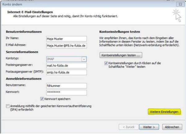 Füllen Sie bitte alle Felder mit Ihrem Namen, Ihrer Hochschulmailadresse, Ihrer fdNummer und Ihrem Novell-Passwort. Der Posteingangsserver ist: mail.hs-fulda.de und der Postausgangsserver heißt smtp.hs-fulda.de Dann klicken Sie bitte auf Weitere Einstellungen