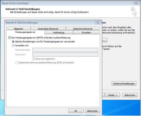 Setzen Sie ein Häkchen vor Der Postausgangsserver (SMTP) erfordert Authentifizierung und wählen Sie Gleiche Einstellungen wie für Posteingangsserver verwenden und wählen Sie den Reiter Erweitert