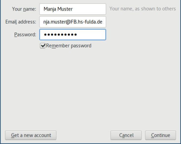 - Geben Sie Ihren vollständigen Namen, ihre Hochschul-Email-Adresse und das Novell-Passwort ein. Wenn Sie auf Erstellen klicken, wird ein Dialogfeld mit dem Hinweis angezeigt, dass der Account manuell konfiguriert werden muss. Klicken Sie auf Weiter.