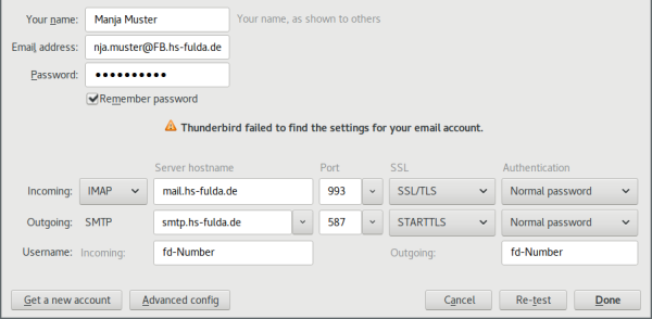 Überprüfen Sie im folgenden Fenster ob Thunderbird die Einstellungen korrekt erkannt hat und korrigieren Sie diese, falls nötig.