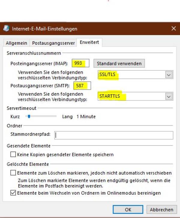 Tragen Sie für den Postausgangsserver (SMTP) die Serveranschlussnummer 587 ein und wählen Sie als verschlüsselten Verbindungstyp STARTTLS aus.