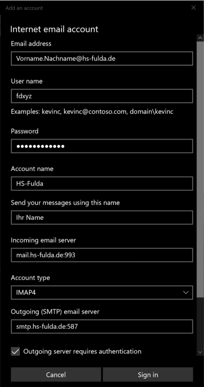 Wählen Sie als Posteingangsserver IMAP, die Server-Adresse mail.hs-fulda.de, den Port 993, den Verschlüsselungstyp SSL/TLS und die Authentifizierung mittels Normal password. Das Passwort und die E-Mails werden durch die Verwendung von SSL/TLS verschlüsselt übertragen.