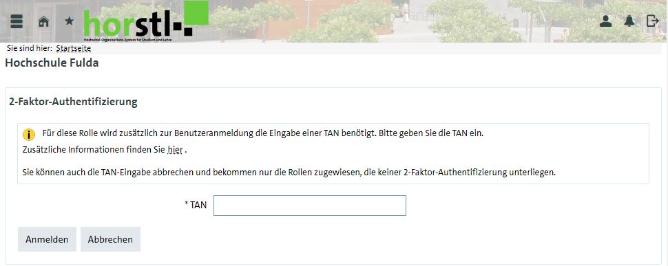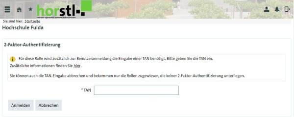 Falls Sie die TAN-Eingabe abbrechen, stehen Ihnen die besonders schützenswerten Rollen (z.B. Prüfer-/in, Prüfungsausschuss, Prüfungsplaner-/in, Department-Administrator-/in, …) in horstl nicht zur Verfügung.