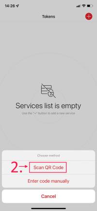 - Auf dem Dialog wählen wir unter 2. „Scan QR Code“ aus. Sollten sie Ihren ersten Token generieren, werden Sie nun dazu aufgefordert der App die Erlaubnis für die Kameranutzung zu erteilen. Hier muss mindestens die Freigabe, für die Einstellung beim Verwenden der App erteilt werden.