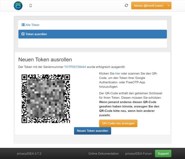 Anschließend erhalten Sie einen QR-Code angezeigt. Der QR-Code enthält den geheimen Schlüssel für Ihren Token.