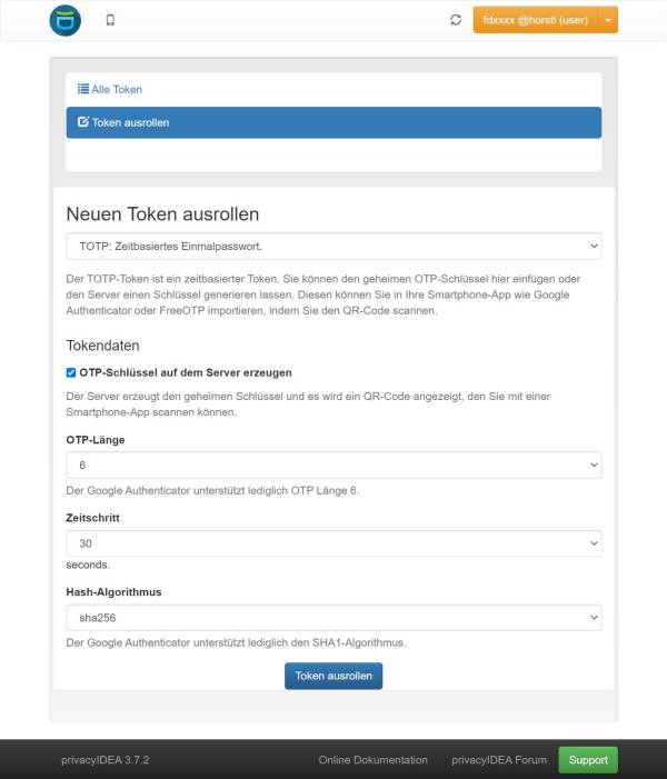 Im nächsten Schritt können Sie über „Token ausrollen“ sich Ihren eigenen Token erzeugen. Die Einstellungen sind bereits mit den empfohlenen Standardeinstellungen vorbelegt, sodass Sie nur noch auf „Token ausrollen“ klicken brauchen.