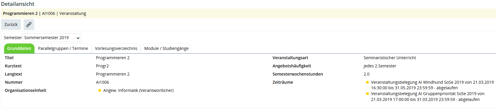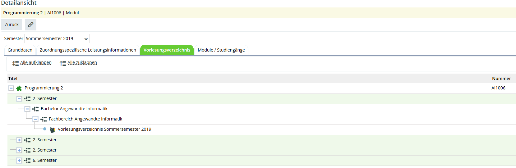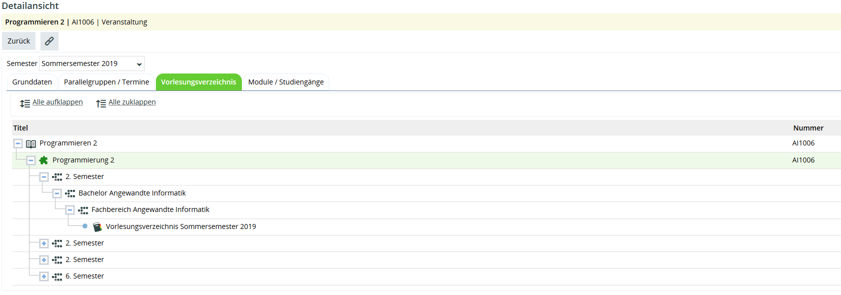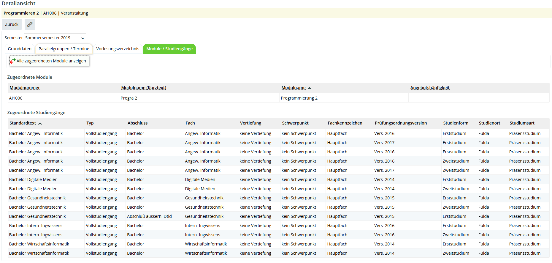 - Position der Veranstaltung im Vorlesungsverzeichnis (Zugehörigkeit zu Modul – Fachsemester – Studiengang – Fachbereich – Zeitsemester)
