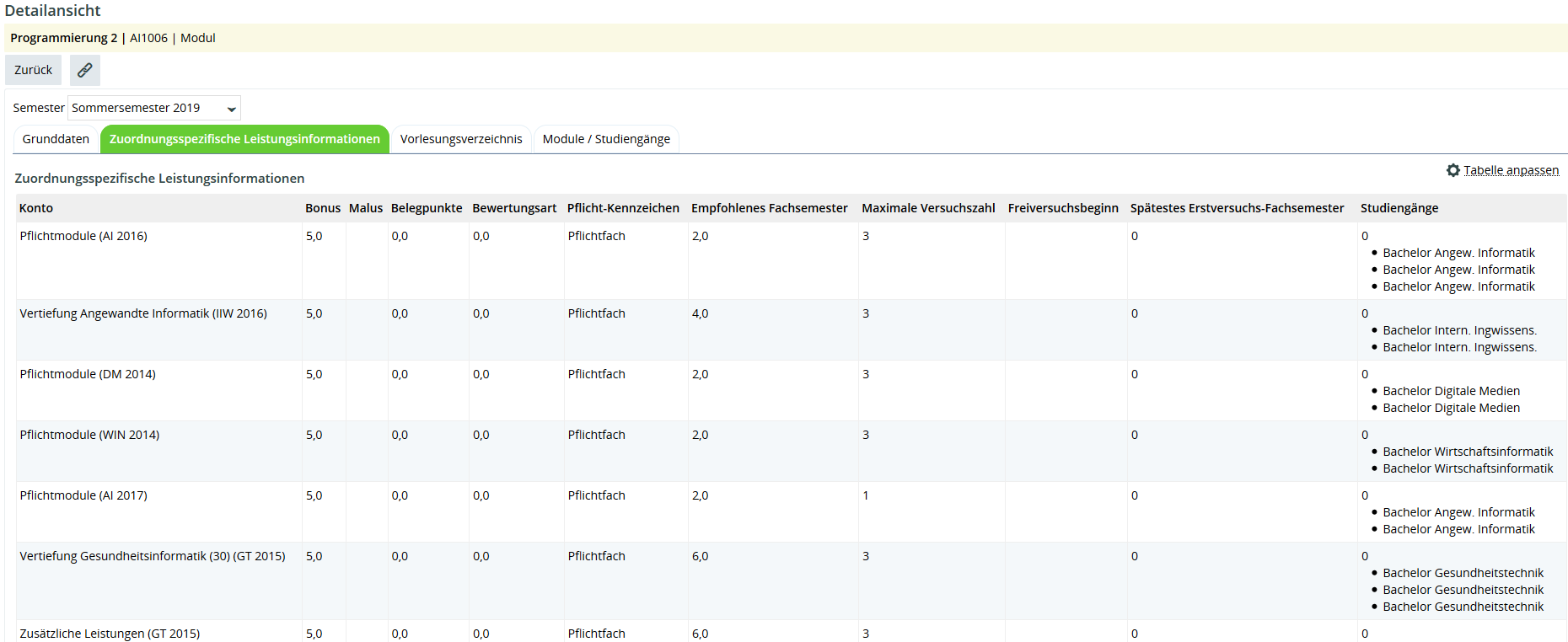 - Zuordnungsspezifische Leistungsinformationen (z. B. Bewertung des Moduls in verschiedenen Studiengängen)
