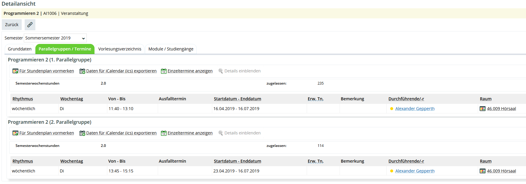 Wird dieselbe Vorlesung nur an einem Termin in der Woche gelesen, gibt es nur die „1. Parallelgruppe“. Wird dieselbe Vorlesung 2x gelesen, gibt es die „1. Parallelgruppe“ und die „2. Parallelgruppe“.