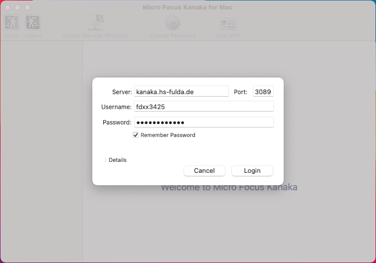 Zur Einrichtung des Clients wird nun eine Server(-adresse) und Port des Kanaka-Dienstes benötigt. Des weiteren müssen Ihre Zugangsdaten (fd-Nummer und Passwort) angegeben werden.
