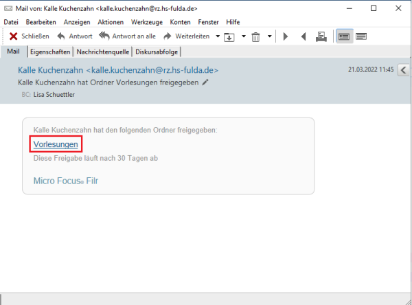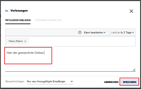 7. Die Person, mit der Sie die Datei/den Ordner geteilt haben wird per E-Mail benachrichtigt.