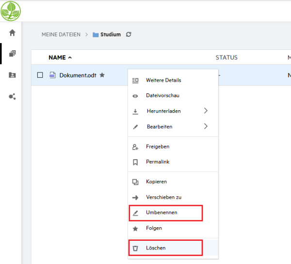 Klicken Sie mit der rechten Maustaste auf das entsprechende Dokument bzw. Ordner und wählen Umbenennen oder Löschen aus.