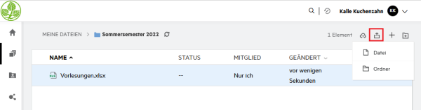 Über das Symbol „Hochladen“ können Sie einzelne Dateien oder ganze Ordner auf die Netzlaufwerke hochladen. Das Hochladen von Dateien ist auch per Drag&Drop möglich.