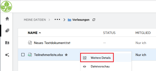 | 1 | Meine Dateien | Die Dateien in Ihrem HOME-Laufwerk. Hier haben zunächst nur Sie selbst Zugriff, allerdings können Sie Dateien für andere Personen freigeben. |