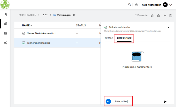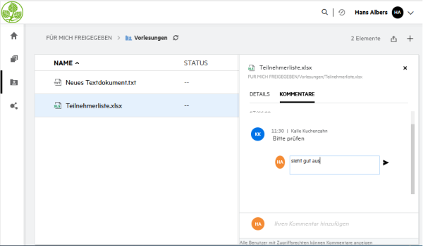 Dateien können mit Kommentaren versehen werden. Dies erlaubt Ihnen eine direkte Kommunikation zu einem spezifischen Dokument mit allen Personen, die Zugriff auf das Dokument besitzen.
