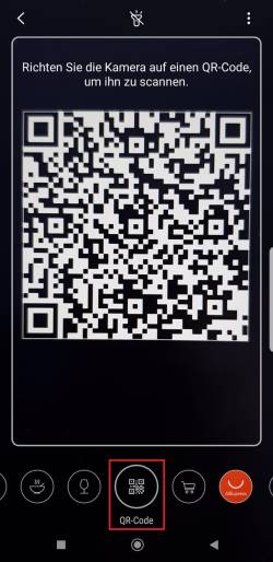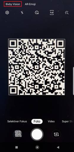 Öffnen Sie Ihre Kamera-App. Hier finden Sie oberhalb die Option „Bixby-Vision“. Wählen Sie diese aus. Sie werden nun gebeten die Kamera vor den QR-Code zu halten.