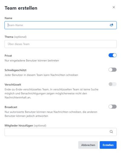 - Privat: Aktivieren Sie diese Option, wenn Sie festlegen wollen, wer Mitglied dieses Team sein soll. Deaktivieren Sie dies, wird das Team für jeden auffindbar sein und jeder kann beitreten.