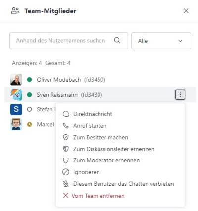 - Zum Diskussionsleiter ernennen: Der Diskussionsleiter kann alles ausführen, was auch der Besitzer kann, außer das Team zu löschen.