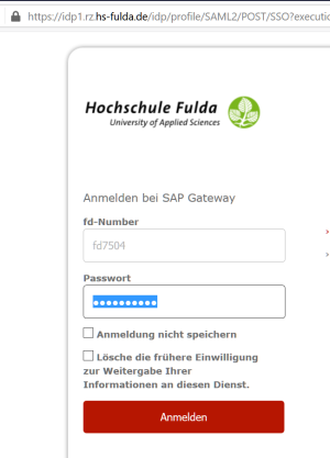 - Sofern Sie Probleme mit der Anmeldung an SAP Fiori haben, wenden Sie sich bitte per E-Mail (it-support@rz.hs-fulda.de) an das Rechenzentrum.