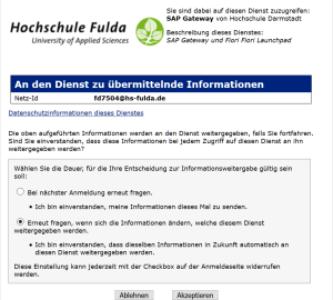 Bei der erstmaligen Anmeldung werden Sie informiert, welche Daten an das FH HRZ übermittelt werden. Nach Wahl des Akzeptieren-Buttons können Sie mit SAP Fiori arbeiten.