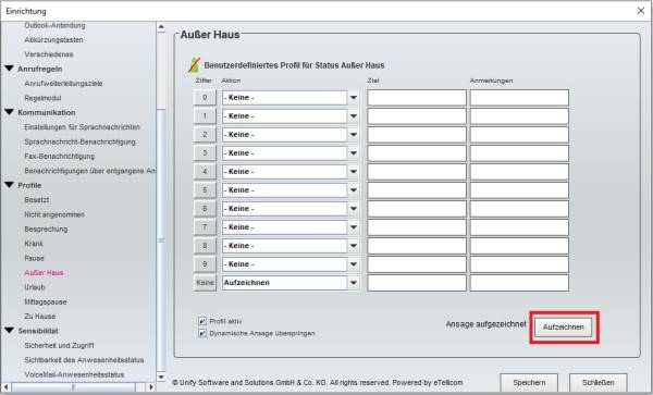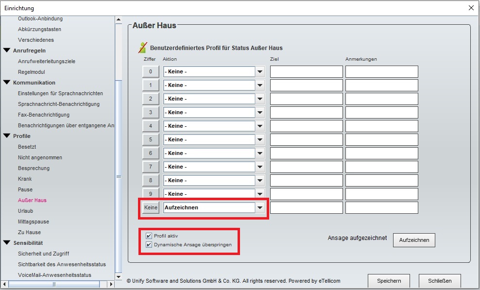 Achten Sie unbedingt darauf, dass keine Aktionen für die einzelnen Ziffern definiert sind, sondern ausschließlich für die Ziffer „Keine“ die Aktion „Aufzeichnen“ gewählt ist.