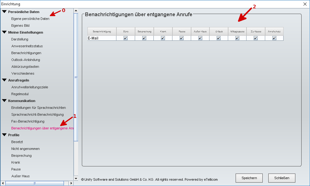 Um E-Mail Benachrichtigunen zu konfigurieren, öffnen Sie die Einstellungen und stellen Sie zunächst unter Eigene persönliche Daten eine E-Mail Adresse ein (0). Anschließend klicken Sie auf Benachrichtigungen über entgangene Anrufe und aktivieren Sie die Benachrichtigung abhängig von Ihrem Anwesenheitsstatus (1, 2).