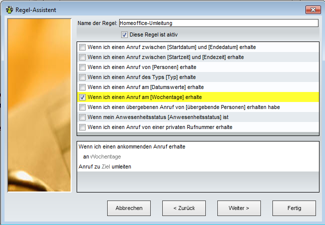 Klicken Sie im Regelmodul den Button Neu, geben Sie einen Namen für die Regel ein, aktivieren Sie das Kästchen Diese Regel ist aktiv, und klicken Sie auf Weiter. Aktivieren Sie im folgenden Fenster das Kästchen bei Wenn mein Anwesenheitsstatus [Anwesenheitsstatus] ist und klicken Sie nun so lange auf Weiter, bis der Button sich nicht mehr klicken lässt. Legen Sie nun abschließend den Anwesenheitsstatus und die Rufnummer auf die weitergeleitet werden soll fest, indem Sie auf die entsprechenden Worte klicken (siehe Bild 3). Aktivieren Sie die Regel durch einen Klick auf Fertig