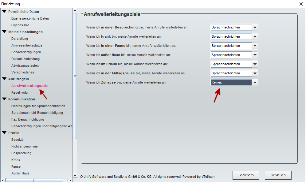 Mit Hilfe von myPortal können Sie eingehende Anrufe auf Basis ihres Status („Im Büro“, „In einer Besprechung“, usw.) oder verschiedener weiterer Regeln (z.B. zeitgesteuert) an eine andere Rufnummer oder ihren Anrufbeantworter weiterleiten.