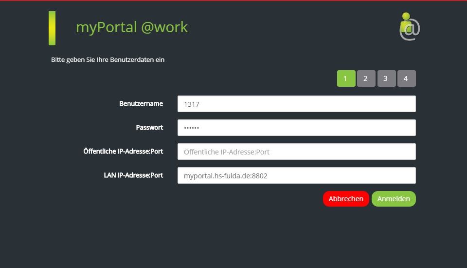 Um myPortal@work zu nutzen, öffnen Sie die Anwendung und melden Sie sich am myPortal Server an. Verwenden Sie dazu folgende Login-Informationen.