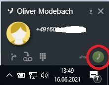 Oder durch Klick auf den grünen Telefonhörer-Button im kleinen Popup, das bei einem eingehenden Anruf im Bereich des Windows-Systrays erscheint: