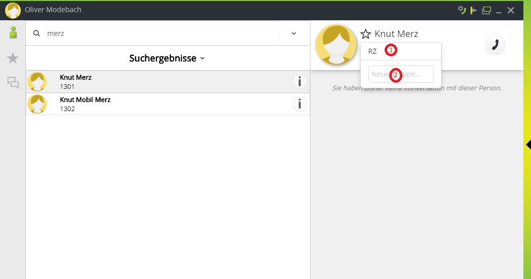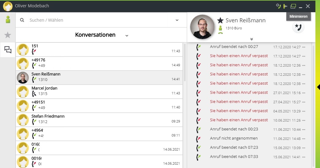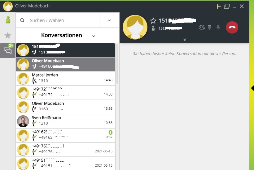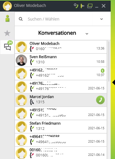 Alternativ können Sie auch einen Teilnehmer aus der Ansicht „Konversationen“ heraus anrufen. Fahren Sie hierzu mit dem Mauszeiger auf den gewünschten Kontakt und dann auf den Button am rechten Rand. Wenn dieser sich grün verfärbt, starten Sie durch einen Klick den Anruf.