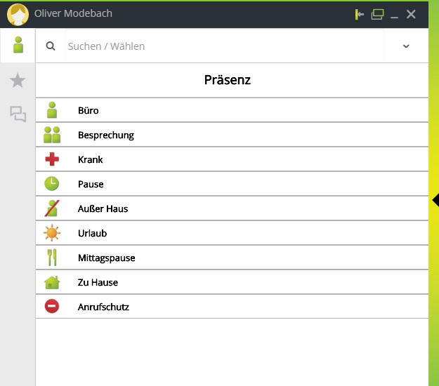 Durch die Auswahl Ihres Präsenzstatus an dieser Stelle können Sie Aktionen auslösen, die Sie im myPortal-for-Desktop-Client definiert haben, ohne diesen explizit starten zu müssen (Rufumleitungen, Aktivieren und Deaktivieren von Regeln, etc.)