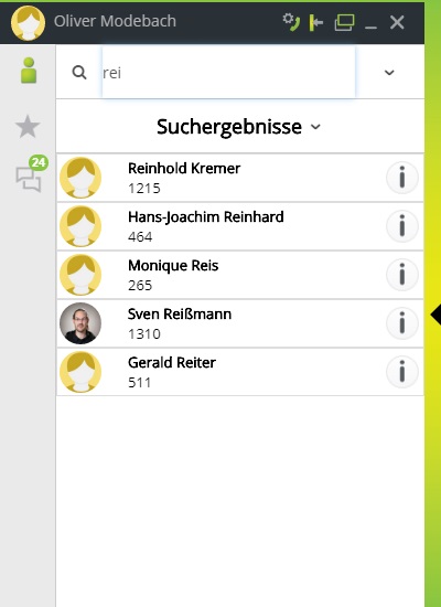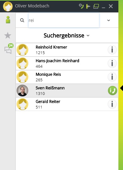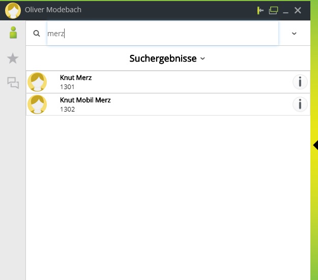 Möchten Sie den gewünschten Teilnehmer direkt aus den Suchergebnissen anrufen, dann fahren Sie mit dem Mauszeiger über den runden Button rechts, bis dieser sich grün verfärbt und klicken Sie darauf.