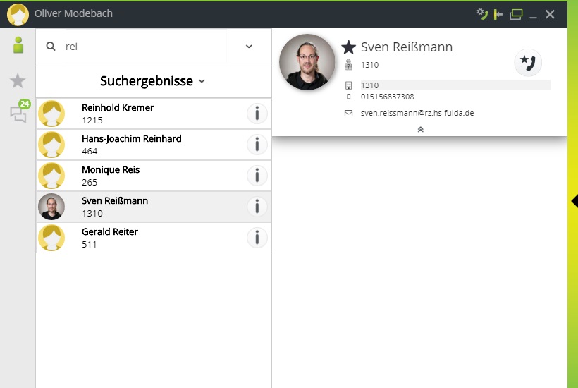 Der Zugriff auf das globale Telefonverzeichnis der Hochschule Fulda, sowie die Pflege eines persönlichen Adressbuchs. Darüber hinaus ist es möglich häufig benötigte Kontakte als Favoriten festzulegen. - Anrufjournal