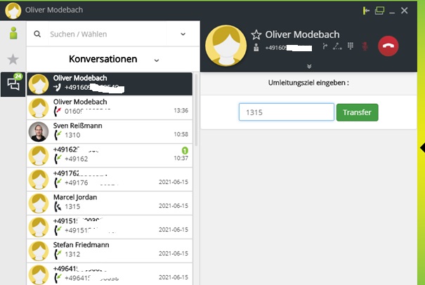Unabhängig vom gewählten Weg sehen Sie nung im Hauptfenster der Anwendung ein Eingabefeld „Umleitungsziel eingeben“. Geben Sie die gewünschte Zielrufnummer ein und drücken Sie den Button „Transfer“. Der Gesprächspartner wird nun weiterverbunden.