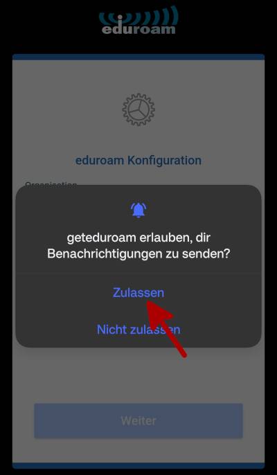 Die Einrichtung des WLAN erfolgt auf Android-Geräten über die im PlayStore erhältliche App geteduroam. Installieren und starten Sie die App auf Ihrem Mobiltelefon oder Tablet (Bild 1 und 2). Nach dem Start der App erfragt diese das Recht, Ihnen Benachrichtigungen zu senden (Bild 3). Keine Sorge, App benötigt dies nur einmalig während der Einrichtung und sendet Ihnen zu keinen späteren Zeitpunkt weitere Nachrichten.