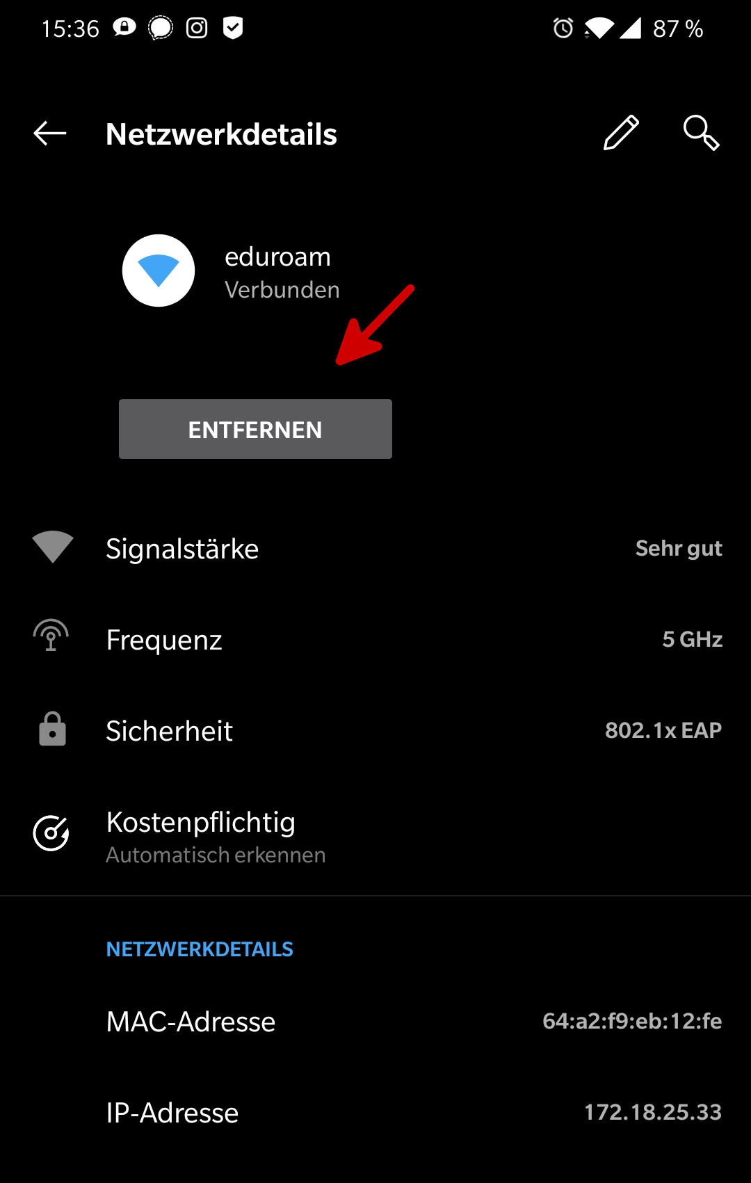 Geschafft: Nach Abschluss der Installation wuerde ein WLAN-Profil für eduroam hinterlegt und Ihr Gerät kann nun weltweit automatisch zu eduroam WLAN-Netzen verbinden.