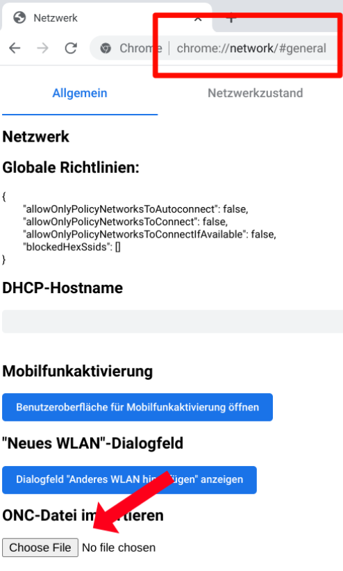 Um die eigentliche Installation durchzuführen, starten Sie den Chrome Browser und öffnen Sie die URL chrome://network/#general. Benutzen Sie den 'Import ONC file' Knopf und wählen Sie die soeben gespeicherte Datei um das Konfigurationsprofil zu laden (Bild 1).