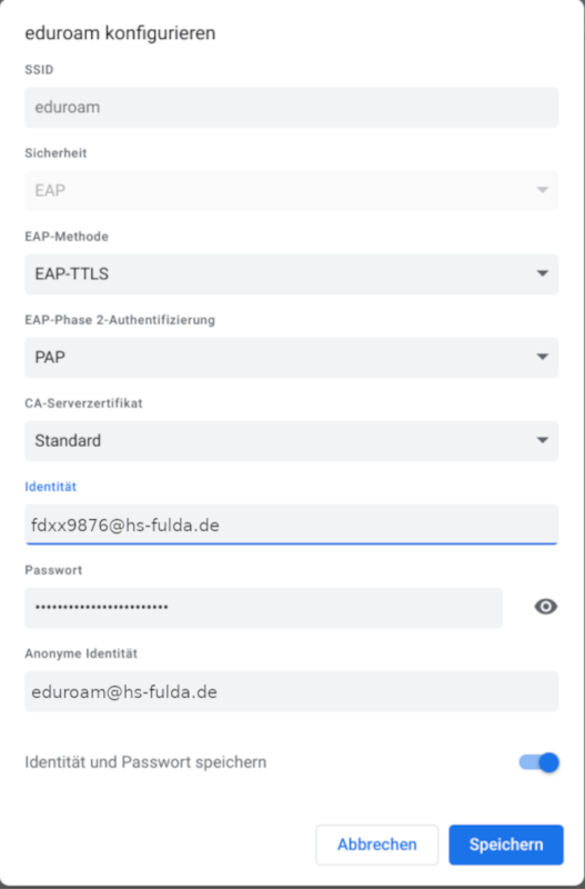 Wechseln Sie in die Netzwerkeinstellungen, wählen eduroam und stellen Sie sicher, dass die Einstellungen wie in Bild 2 festgelegt wurden.