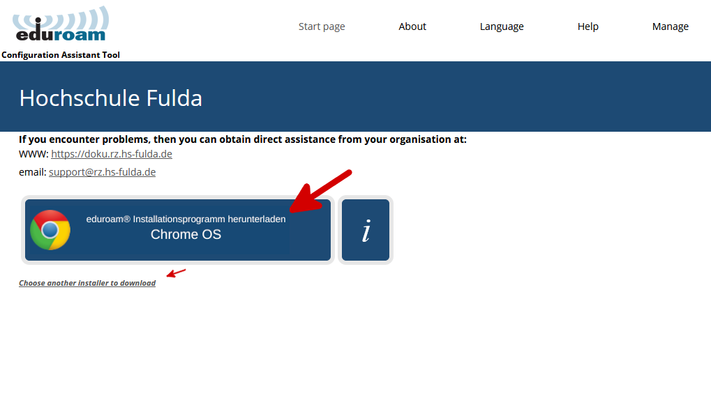 Besuchen Sie die Webseite https://cat.eduroam.org und laden Sie das Installationsprogramm für die Hochschule Fulda herunter. Dazu klicken Sie bitte auf den großen Download-Button, und wählen dann die Hochschule Fulda aus.