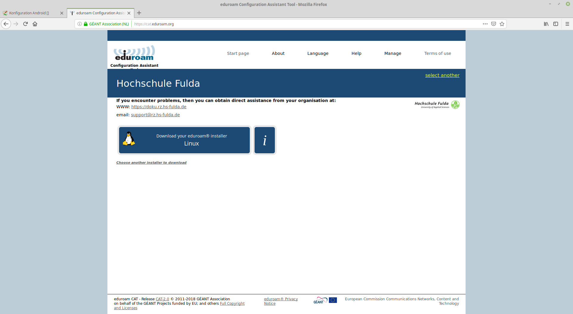 Besuchen Sie die Webseite https://cat.eduroam.org und laden Sie das Installationsprogramm für die Hochschule Fulda herunter. Dazu klicken Sie bitte auf den großen Download-Button und wählen dann die Hochschule Fulda aus.