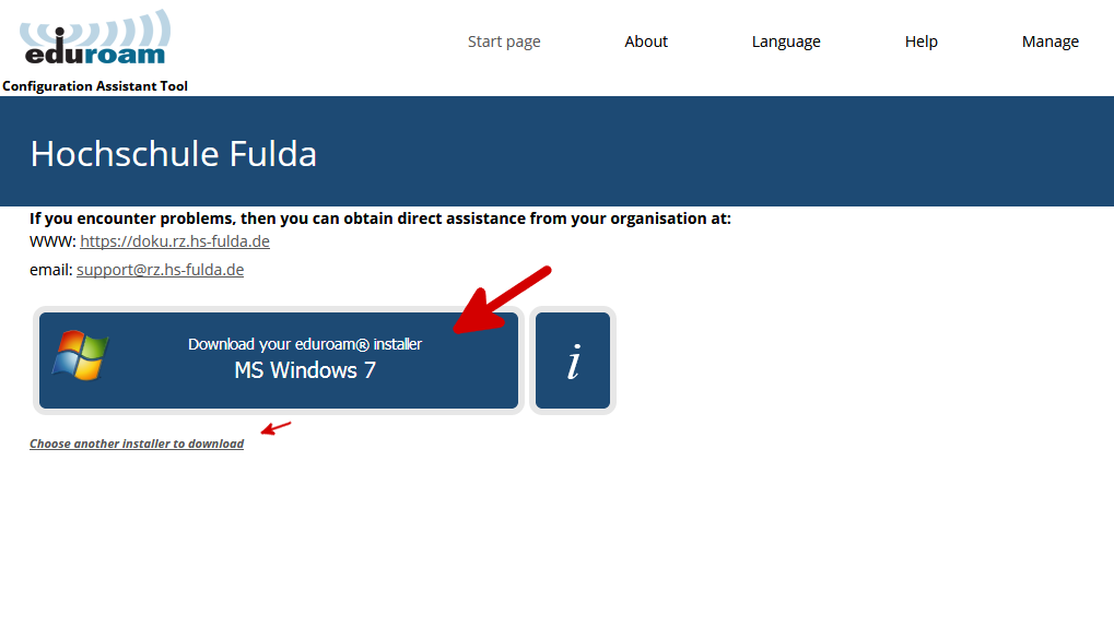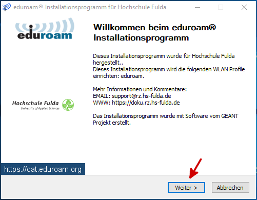Besuchen Sie die Webseite https://cat.eduroam.org und laden Sie das Installationsprogramm für die Hochschule Fulda herunter. Dazu klicken Sie bitte auf den großen Download-Button, und wählen dann die Hochschule Fulda aus.