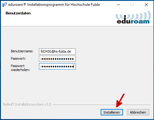 Führen Sie nun die Installation durch, indem Sie die soeben gespeicherte Datei ausführen. Während des Installationsprozesses werden Sie aufgefordert, ihre fd-Nummer und ihr Passwort einzugeben.