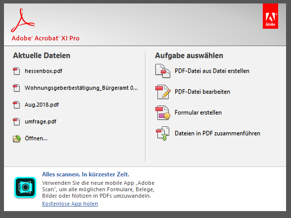 Öffnen Sie hierfür Ihren Adobe Reader. Sie werden direkt mit verschiedenen Optionen begrüßt.