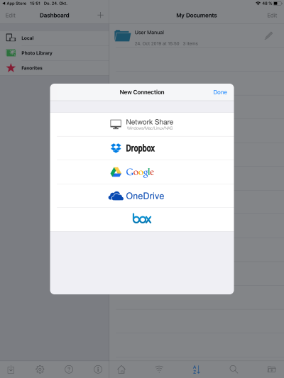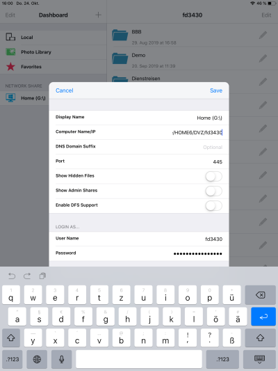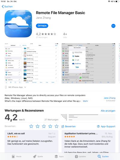 Der Zugriff auf Ihr persönliches Verzeichnis, beziehungsweise ihr Gruppenlaufwerk ist unter iOS mittels SMB möglich. Im Apple Appstore stehen dafür eine Reihe verschiedener Apps zur Verfügung. Im folgenden beschreiben wir die Konfiguration beispielhaft anhand der App Remote File Manager Basic, die Sie kostenlos beziehen können.