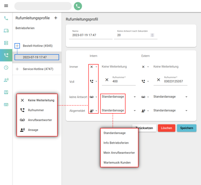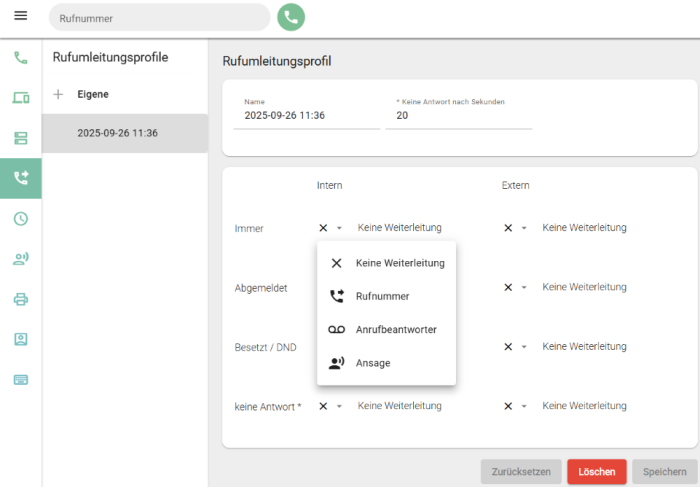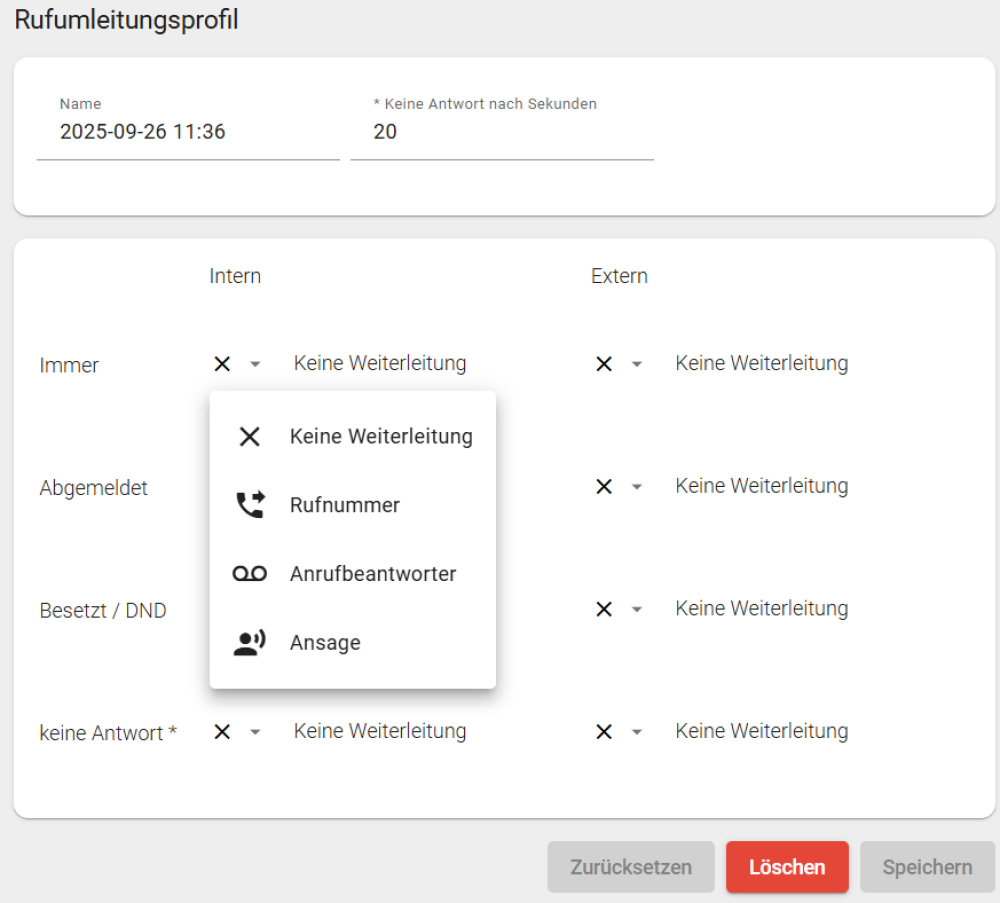 Für die Einrichtung müssen Sie lediglich unter „Rufumleitungsprofile” die Art und das Ziel der Umleitung für mindestens einen Anwendungsfall auswählen.